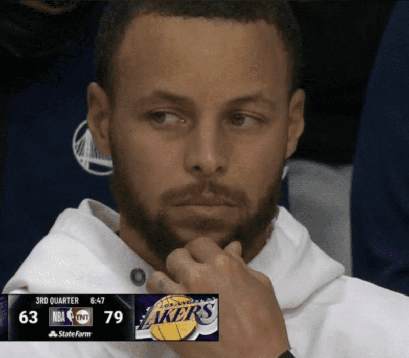The Warriors have some sensitive absences on Wiggins and Stephen Curry, and the latter, at one point in the 3rd quarter, when the Lakers were leading by 16 points, his face was placed on live tv showing that he wasn't happy at all with his team.