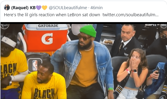The little girl was watching the game when LeBron just sat down right next to her, and she took a second to recognize the Lakers superstar. When she noticed him, she was immediately shocked and took her hands to cover her mouth without believing it. This is Curry's home, but LeBron is the one getting that kind of reaction; he is the GOAT, without a doubt.